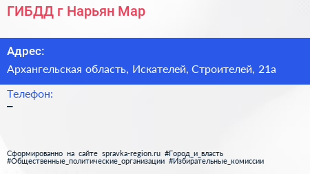 ГИБДД, г. Нарьян-Мар по адресу Архангельская область, Искателей, Строителей, 21а в дальнейшем Организация, размещена в следующих категориях: