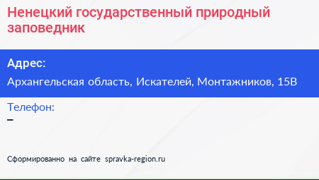 Ненецкий, государственный природный заповедник по адресу Архангельская область, Искателей, Монтажников, 15В в дальнейшем Организация, размещена в следующих категориях: