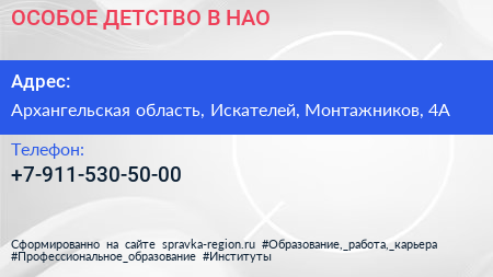 ОСОБОЕ ДЕТСТВО В НАО по адресу Архангельская область, Искателей, Монтажников, 4А в дальнейшем Организация, размещена в следующих категориях: