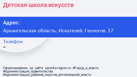 Детская школа искусств по адресу Архангельская область, Искателей, Геологов, 17 в дальнейшем Организация, размещена в следующих категориях: