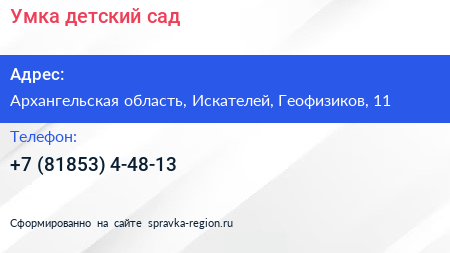 Умка, детский сад по адресу Архангельская область, Искателей, Геофизиков, 11 в дальнейшем Организация, размещена в следующих категориях: