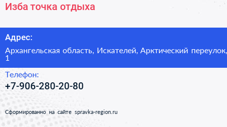 Изба, точка отдыха по адресу Архангельская область, Искателей, Арктический переулок, 1 в дальнейшем Организация, размещена в следующих категориях: