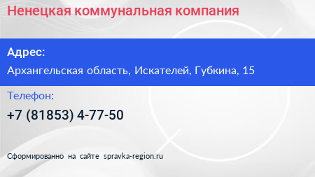 Ненецкая коммунальная компания по адресу Архангельская область, Искателей, Губкина, 15 в дальнейшем Организация, размещена в следующих категориях: