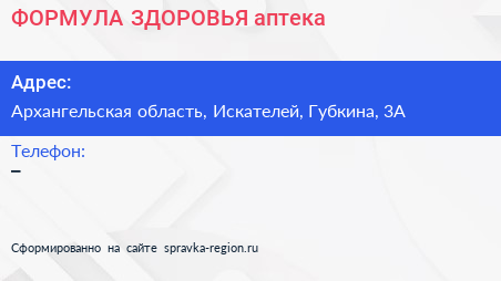 ФОРМУЛА ЗДОРОВЬЯ, аптека по адресу Архангельская область, Искателей, Губкина, 3А в дальнейшем Организация, размещена в следующих категориях: