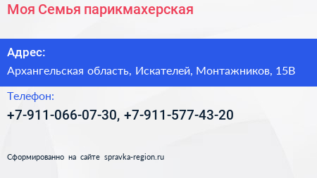 Моя Семья, парикмахерская по адресу Архангельская область, Искателей, Монтажников, 15В в дальнейшем Организация, размещена в следующих категориях: