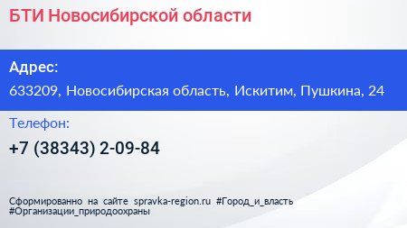 БТИ Новосибирской области по адресу 633209, Новосибирская область, Искитим, Пушкина, 24 в дальнейшем Организация, размещена в следующих категориях: