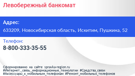 Левобережный, банкомат по адресу 633209, Новосибирская область, Искитим, Пушкина, 52 в дальнейшем Организация, размещена в следующих категориях: