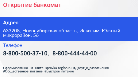Открытие, банкомат по адресу 633208, Новосибирская область, Искитим, Южный микрорайон, 56 в дальнейшем Организация, размещена в следующих категориях: