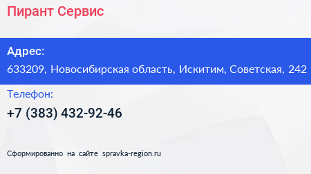 Пирант-Сервис по адресу 633209, Новосибирская область, Искитим, Советская, 242 в дальнейшем Организация, размещена в следующих категориях: