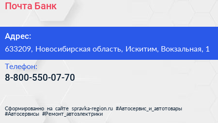 Почта Банк по адресу 633209, Новосибирская область, Искитим, Вокзальная, 1 в дальнейшем Организация, размещена в следующих категориях: