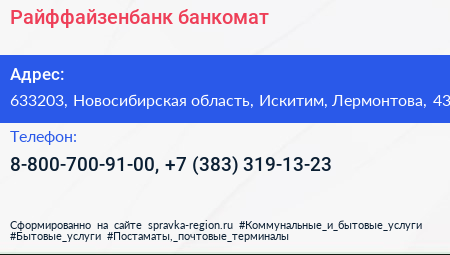 Райффайзенбанк, банкомат по адресу 633203, Новосибирская область, Искитим, Лермонтова, 43 в дальнейшем Организация, размещена в следующих категориях: