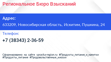 Региональное Бюро Взысканий по адресу 633209, Новосибирская область, Искитим, Пушкина, 24 в дальнейшем Организация, размещена в следующих категориях: