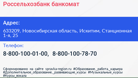 Россельхозбанк, банкомат по адресу 633209, Новосибирская область, Искитим, Станционная 1-я, 25 в дальнейшем Организация, размещена в следующих категориях: