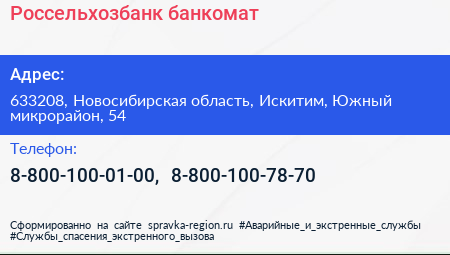 Россельхозбанк, банкомат по адресу 633208, Новосибирская область, Искитим, Южный микрорайон, 54 в дальнейшем Организация, размещена в следующих категориях:
