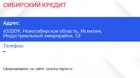 СИБИРСКИЙ КРЕДИТ по адресу 633209, Новосибирская область, Искитим, Индустриальный микрорайон, 52 в дальнейшем Организация, размещена в следующих категориях: