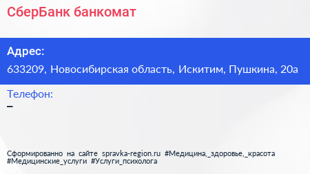 СберБанк, банкомат по адресу 633209, Новосибирская область, Искитим, Пушкина, 20а в дальнейшем Организация, размещена в следующих категориях: