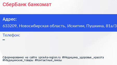 СберБанк, банкомат по адресу 633209, Новосибирская область, Искитим, Пушкина, 81а/3 в дальнейшем Организация, размещена в следующих категориях: