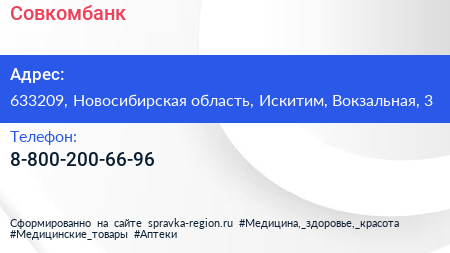 Совкомбанк по адресу 633209, Новосибирская область, Искитим, Вокзальная, 3 в дальнейшем Организация, размещена в следующих категориях: