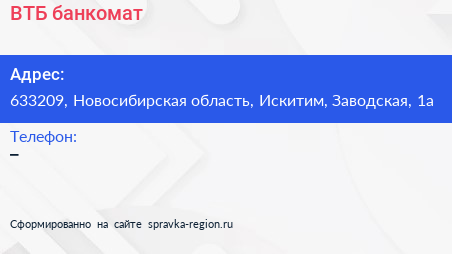 ВТБ, банкомат по адресу 633209, Новосибирская область, Искитим, Заводская, 1а в дальнейшем Организация, размещена в следующих категориях: