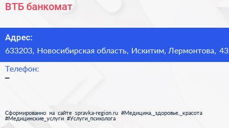 ВТБ, банкомат по адресу 633203, Новосибирская область, Искитим, Лермонтова, 43 в дальнейшем Организация, размещена в следующих категориях: