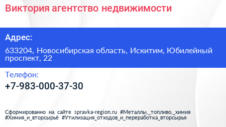 Виктория, агентство недвижимости по адресу 633204, Новосибирская область, Искитим, Юбилейный проспект, 22 в дальнейшем Организация, размещена в следующих категориях:
