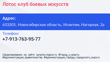 Лотос, клуб боевых искусств по адресу 633205, Новосибирская область, Искитим, Нагорная, 2а в дальнейшем Организация, размещена в следующих категориях: