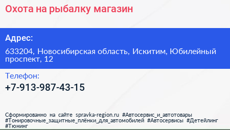 Охота на рыбалку, магазин по адресу 633204, Новосибирская область, Искитим, Юбилейный проспект, 12 в дальнейшем Организация, размещена в следующих категориях: