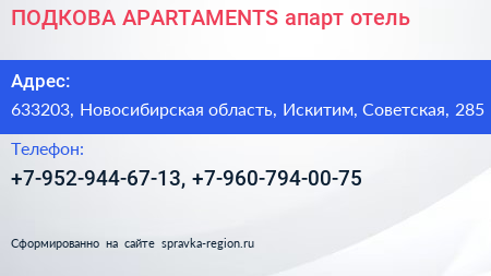ПОДКОВА APARTAMENTS, апарт-отель по адресу 633203, Новосибирская область, Искитим, Советская, 285 в дальнейшем Организация, размещена в следующих категориях: