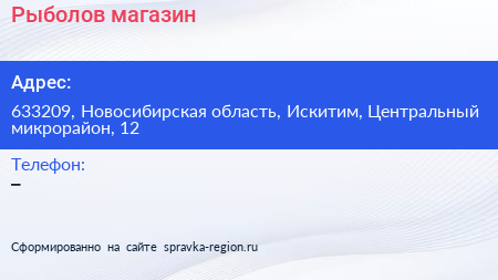 Рыболов, магазин по адресу 633209, Новосибирская область, Искитим, Центральный микрорайон, 12 в дальнейшем Организация, размещена в следующих категориях: