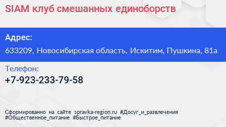 SIAM, клуб смешанных единоборств по адресу 633209, Новосибирская область, Искитим, Пушкина, 81а в дальнейшем Организация, размещена в следующих категориях: