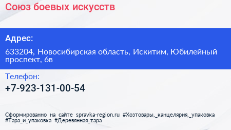Союз боевых искусств по адресу 633204, Новосибирская область, Искитим, Юбилейный проспект, 6в в дальнейшем Организация, размещена в следующих категориях: