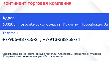 Континент, торговая компания по адресу 633203, Новосибирская область, Искитим, Прорабская, 3а в дальнейшем Организация, размещена в следующих категориях: