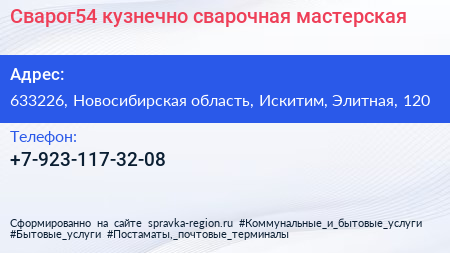 Сварог54, кузнечно-сварочная мастерская по адресу 633226, Новосибирская область, Искитим, Элитная, 120 в дальнейшем Организация, размещена в следующих категориях: