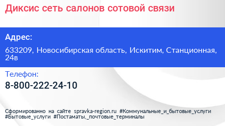 Диксис, сеть салонов сотовой связи по адресу 633209, Новосибирская область, Искитим, Станционная, 24в в дальнейшем Организация, размещена в следующих категориях: