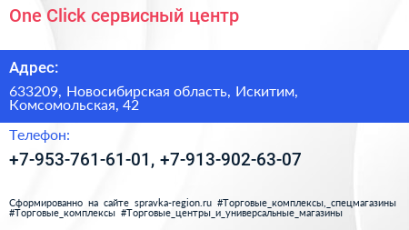 One-Click, сервисный центр по адресу 633209, Новосибирская область, Искитим, Комсомольская, 42 в дальнейшем Организация, размещена в следующих категориях: