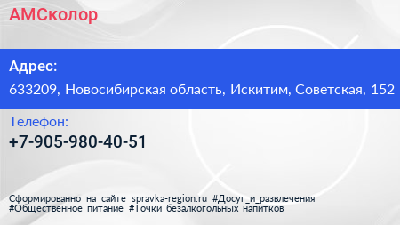 АМСколор по адресу 633209, Новосибирская область, Искитим, Советская, 152 в дальнейшем Организация, размещена в следующих категориях: