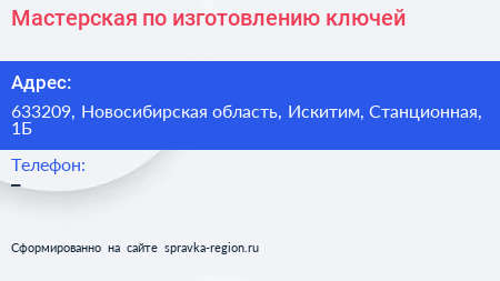 Мастерская по изготовлению ключей по адресу 633209, Новосибирская область, Искитим, Станционная, 1Б в дальнейшем Организация, размещена в следующих категориях: