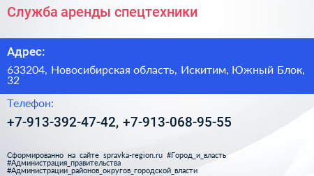 Служба аренды спецтехники по адресу 633204, Новосибирская область, Искитим, Южный Блок, 32 в дальнейшем Организация, размещена в следующих категориях: