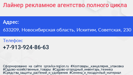 Лайнер, рекламное агентство полного цикла по адресу 633209, Новосибирская область, Искитим, Советская, 230 в дальнейшем Организация, размещена в следующих категориях: