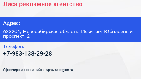 Лиса, рекламное агентство по адресу 633204, Новосибирская область, Искитим, Юбилейный проспект, 2 в дальнейшем Организация, размещена в следующих категориях: