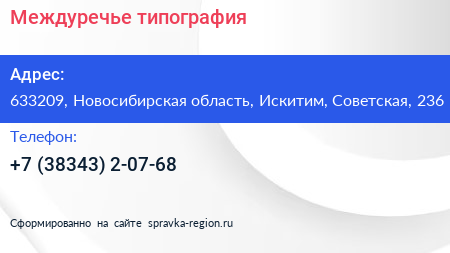 Междуречье, типография по адресу 633209, Новосибирская область, Искитим, Советская, 236 в дальнейшем Организация, размещена в следующих категориях: