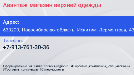 Авантаж, магазин верхней одежды по адресу 633203, Новосибирская область, Искитим, Лермонтова, 43 в дальнейшем Организация, размещена в следующих категориях:
