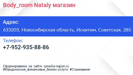 Body_room Nataly, магазин по адресу 633203, Новосибирская область, Искитим, Советская, 285 в дальнейшем Организация, размещена в следующих категориях: