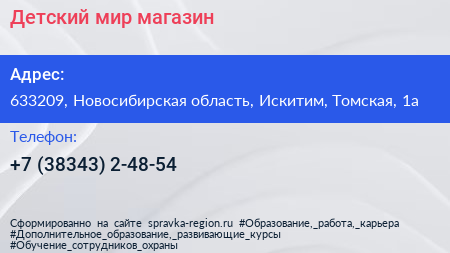 Детский мир, магазин по адресу 633209, Новосибирская область, Искитим, Томская, 1а в дальнейшем Организация, размещена в следующих категориях: