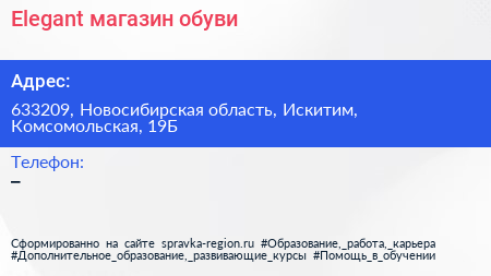Elegant, магазин обуви по адресу 633209, Новосибирская область, Искитим, Комсомольская, 19Б в дальнейшем Организация, размещена в следующих категориях: