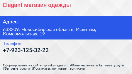 Elegant, магазин одежды по адресу 633209, Новосибирская область, Искитим, Комсомольская, 19 в дальнейшем Организация, размещена в следующих категориях: