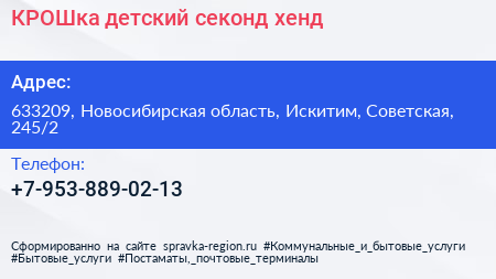 КРОШка, детский секонд-хенд по адресу 633209, Новосибирская область, Искитим, Советская, 245/2 в дальнейшем Организация, размещена в следующих категориях: