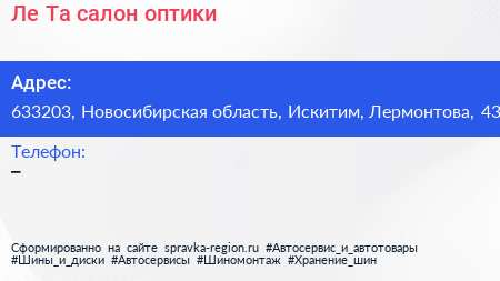 Ле Та, салон оптики по адресу 633203, Новосибирская область, Искитим, Лермонтова, 43 в дальнейшем Организация, размещена в следующих категориях: