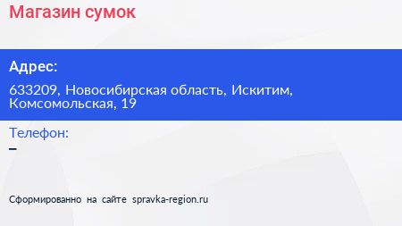 Магазин сумок по адресу 633209, Новосибирская область, Искитим, Комсомольская, 19 в дальнейшем Организация, размещена в следующих категориях: