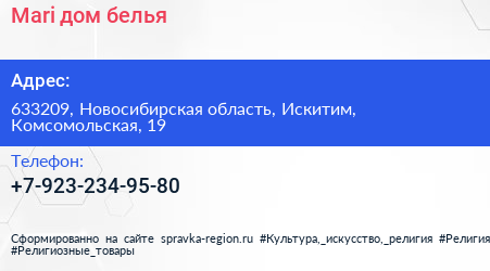 Mari, дом белья по адресу 633209, Новосибирская область, Искитим, Комсомольская, 19 в дальнейшем Организация, размещена в следующих категориях: